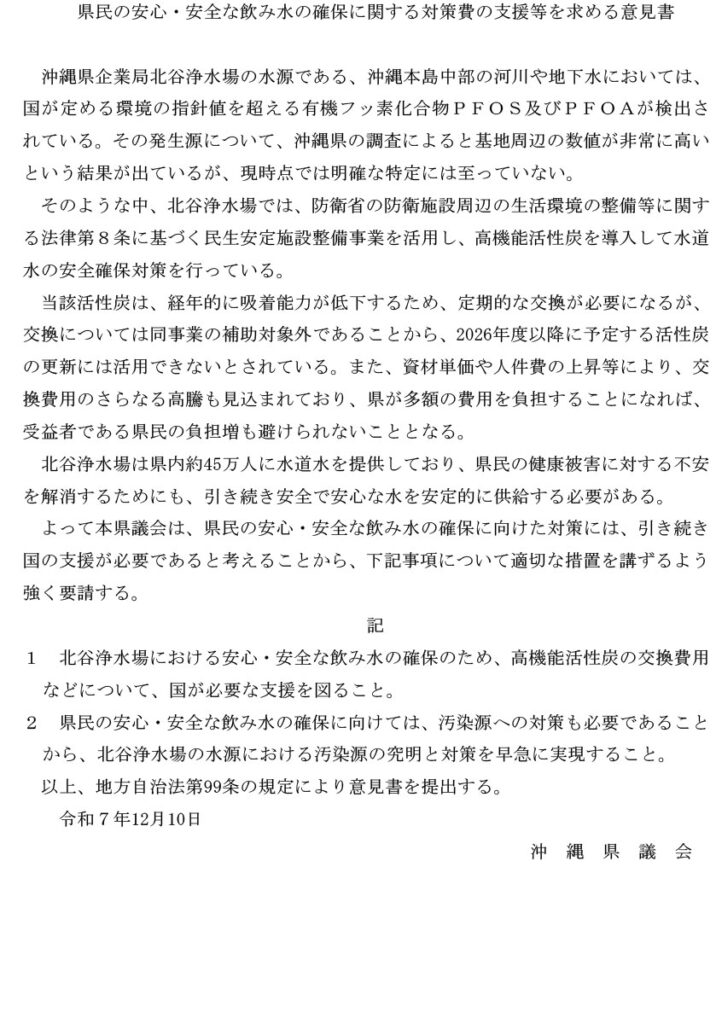 本日、沖縄県議会において、県民の安心・安全な飲み水の確保に向けた対策には、引き続き国の支援が必要であると考えることから「県民の安心・安全な飲み水の確保に関する対策費の支援等を求める意見書」(議員提出議案第1号)を提出いたしました。提出者を代表して島尻忠明議員が意見を述べました。